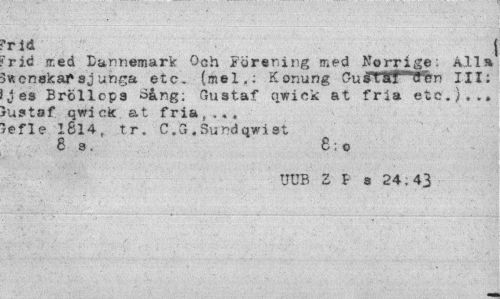 //// 'rid • j //// 'rid ir.ed Dannemark Och Förening med Norrige: All» Ivtenskaf aj un^a etc. (mel.: Konung Cusl&T^fl^n III: J es Bröllops Sång; Gustaf qwick at fria etc.}.., rustaf qwick at fria,,., ref le 1614, tr. C .3. Sundqwi st //// 8s, 8;o //// UUB Z F s 24,43 ////