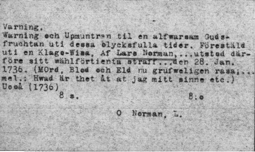 //// Varning, //// Warning »ch Upauntr^n til en alfwaraani 3ués» fruchtan uti desea felyeksfulla tider. Föreatäli uti en Klaga-Wiaa, Af Lare Herman,...ut»ted dar-före sitt wählf ört i en ta st i*af rT.'"7« en 28. Jan. 1736. {MOrd, Bloi «ch E14 nu grufweligen rasa*.« mel.; Kwad Hr thet at at jag mitt sinne etc,) Uoea (1736) //// 8 a.. 8;» //// O Nornan. L. ////