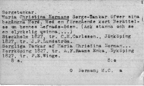 //// Sorgetankar. //// *?aria Chriatina Normans 3srge-Tankar öfwer sina . begångna STorlTWed en föregående kort Berättel* : se cm hennes Lefnads-öden, (Ack stanna och se en olyckelig qwinna, ., . ) //// Stockholm 1827, tr. C.M.Carlsson., .Jönköping 1827, tr. J.P.Lundström. //// Sorgliga Tankar af "aria Christina Korman... Norrköping 1827, tr. A.F.Raams Bnka,-Nyköping 1827, tr. P.E.Winge. //// 8 s. 8;o //// 0 Norman, M.C. a ////