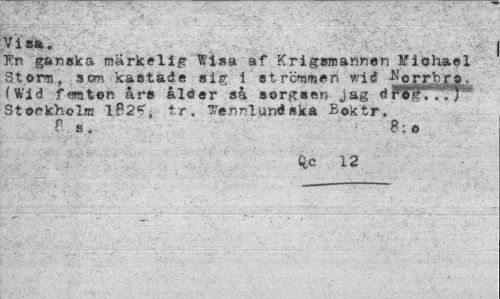 //// Via». //// J!n ganska märkelig Wisa af Krigsmannen Miohael Storm, som kastade sig i strömmen wid ^orrbr?.. (Wid femton års ålder så sorgsen jag dPSfTTTT*" Storkholm 1?2<, tr. Tennlund ska Boktr. C s. //// ^c 12 ////