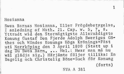 //// 1 //// Hosianna //// Swea Barnas Hosianna, Eller Frögdebetygelse, I anledning af Math. 21. Cap. w. 5, 7, 8. Yttradt wid den Stormägtigste Allernådigste Konung Gustaf Den Fjerde Adolph Sweriges Gö-thes och Wändes Konungs Höga Krönings=Fäst uti Norrköping den 3 April 1800 (Statt up i dag Du Swea Barn, ... Mel.: Hwar man må nu wäl glädja sig.) Härjämte följer tillika: En Dagelig och Christelig Böne=Suck för Konung //// (forts) //// SVA A 3S1 ////