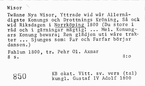 //// Wisor //// Twänne Nya Wisor, Yttrade wid wår Allernå-digste Konungs och Drottnings Kröning, Så ock wid Riksdagen i Norrköping 1800 (Du store i råd och i gärningar mägtigl ... Mel. Konungars Konung bewara; Ren glädjen uti wåre trakter ... Sjunges som: Far och Farfar börjar dansen.) //// Fahlun 1800, tr. Pehr 01. Axmar 8 s. 8:o //// nen KB okat. Vitt. sv. vers (tal) //// ÖOU kungl. Gustaf IV Adolf 1800 ////