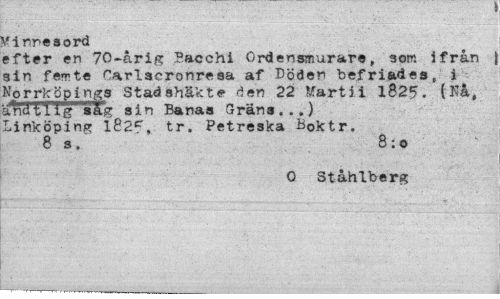 //// Minnesord //// efter en 70-årig Bacchi Ordensmurare, som ifrån | sin femte Carlscronresa af Döden befriades, i Norrköpings Stadshäkte den 22 Marti i 1825. (Nå, and11ig aag sin Banas Gräns...) Linköping l82c, tr. Petreska B0ktr. //// 8 s . 8: o //// O Ståhlberg ////