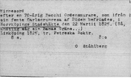 //// ' i me 3 ord //// efter er 70-årig Eacchi Ordenamurare, som ifrån j sin femte C&rlseronresa af Döden befriades, i Korrkopings Stad ah|kte den 22 Marti i 1825 i (Nå, ändtlig'"såg sin Banas Gräns..,} Linköping 1825, tr. Petreäka B0ktr, //// 8 s. 8 : o //// O Ståhlberg ////