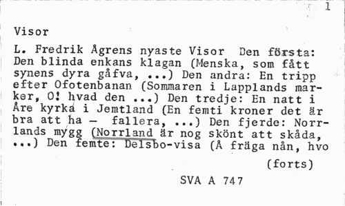 //// Visor //// L. Fredrik Ågrens nyaste Visor Den första: Den blinda enkans klagan (Menska, som fått synens dyra gåfva, ...) Den andra: En tripp efter Ofotenbanan (Sommaren i Lapplands marker, 01 hvad den ...) Den tredje: En natt i Åre kyrka i Jemtland (En femti kröner det är bra att ha - fallera, ...) Den fjerde: Norrlands mygg (Norrland är nog skönt att skåda, ...) Den femte T Öélsbo-visa (Ä fräga nån, hvo //// (forts) //// SVA A 74 7 ////