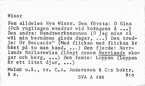 //// Wisor //// Fem alldeles Nya Wisor. Den första: 0 Gina (Och ynglingen wandrar wid koängens å ...) Den andra: Handtwerksmannen (0 jag mins så wäl min barndoms glada dagar, »..) Den tredje: Ur Boccacio" (Med flickan med flickan är bäst på tu man hand...) Den fjerde: Norrlands Rallarewisa (Långt genom Norrlands skogar och berg, ..,) Den femte: Loppan (Loppan är ett litet djur, ,..) //// Malmö u.å., tr. C,A. Andersson & C:s boktr. 8 Si SVA A 486 8:0 ////