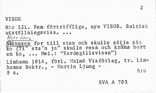 //// 2 //// VISOR //// N:o 121. Fem förträffliga, nya VISOR. Baltisk utställningsvisa. ... //// Norr Iay-% //// SkLnnsen for till stan och skulle sälja sin Fo (Ti'1 ""sta'n ja"' skulle resa och kräma bort en ko, ... Mel.: "Kardegillsvisan") //// Limhamn 1914, förl. Malmö Visförlag, tr. Limhamns Boktr., - Martin Liung -8 s. 3:o //// SVA A 70 3 ////