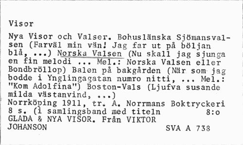 //// Visor //// Nya Visor och Valser. Bohuslänska Sjömansval-sen (Farväl min vänj Jag far ut på böljan blå, ...) Norska Valsen (Nu skall jag sjunga en fin melodi ... Mel.: Norska Valsen eller Bondbröllop) Balen på bakgården (När som jag-bodde i Ynglingagatan numro nitti, ... Mel.: "Kom Adolfina") Boston-Vals (Ljufva susande milda västanvind, ...) //// Norrköping 1911, tr. A. Norrmans Boktryckeri 8 s. (i samlingsband med titeln 8:0 //// GLADA & NYA VISOR. Från VIKTOR JOHANSON SVA A 738 ////
