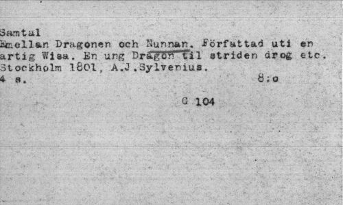 //// Samtal //// anellan Dragonen och Nunnan, författad uti en irtig Wisa. Bn ung DragS'n'Til striden drog etc. Stockholm 1801, A.J .Sylvenius. i- a. 8; o //// G 104 ////