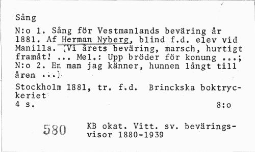 //// Sång //// N:o 1. Sång för Vestmanlands beväring år 1881. Af Herman Nyberg, blind f.d. elev vid Manilla. [Vi årets beväring, marsch, hurtigt framåtl ... Mel.: Upp bröder för konung N:o 2. En man jag känner, hunnen långt till åren ...) //// Stockholm 1881, tr. f.d. Brinckska boktryckeriet //// 4 s. 8:o //// cnn KB okat. Vitt. sv. bevärings- //// visor 1880-1939 ////