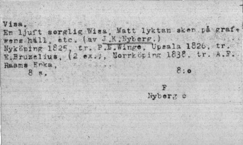 //// Vis». //// Er ljuft sorglig Wisa, Katt lyktan sker p-å graf-r rirz hill» etc . ( av J .K jgyberr.) . , //// Nyköping 1825. tr. P .E.Wingi .""Vpeala 1826, tr, E.Sruzel ius, (2 ex,;, Norrköping 183?, tr. A.P. Raarcs Erika, //// 8B. 8:0 //// F //// Nyberg c ////