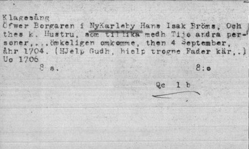 //// Kla^esar^ //// C*"wer Borgaren i NyÄarleby Härs Isak Broms» Och thes k. Hustru, som TTTTf^T-sedb Tij© andra per-; sönerömkeligen omleomme, then 4 September, //// åhr 1704, (HJelp Gudb, hielp trogne Fader kär,.) Uo 1706 //// 8 S. 8;o //// qe 1 b ////