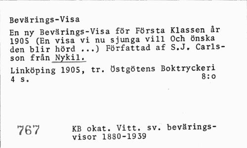//// Bevärings-Visa //// En ny Bevärings-Visa för Första Klassen år 1905 (En visa vi nu sjunga vill Och önska den blir hörd ...) Författad af S.J. Carlsson från Nykil. //// Linköping 1905, tr. östgötens Boktryckeri 4 s. 8:o //// 756 KB okat» Vitt. sv. bevärings- //// visor 1880-1939 ////