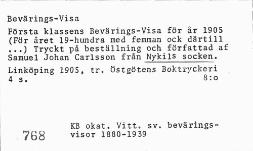 //// Bevärings-Visa //// Första klassens Bevärings-Visa för år 1905 (För året 19-hundra med femman ock därtill ...) Tryckt på beställning och författad af Samuel Johan Carlsson från Nykils socken. //// Linköping 1905, tr. östgötens Boktryckeri 4 s. 8:o //// Mnq KB okat. Vitt. sv. bevärings- //// /06 visor 1880-1939 ////