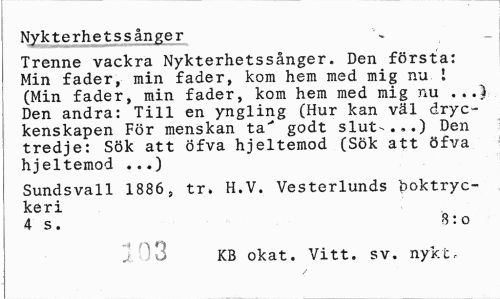 //// Nykterhetssånger //// Trenne vackra Nykterhetssånger. Den första: Min fader, min fader, kom hem med mig nu I (Min fader, min fader, kom hem med mig nu . Den andra: Till en yngling (Hur kan väl dryc-kenskapen För menskan ta' godt slut-...) Den tredje: Sök att Öfva hjeltemod (Sök att öfva hjeltemod ...) //// Sundsvall 1886, tr. H.V. Vesterlunds boktryckeri //// 4 s. 8:0 //// 103 KB okat. Vitt. sv. nyfct. ////