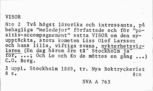 //// VISOR //// N:o 2 Två högst lärorika och intressanta, på behagliga "melodejor" författade och för "po-sitiv-accompagnement" satta VISOR om den nyupptäckta, stora kometen Liss Olof Larsson och hans lilla, viftiga svans, nykterhetsvig-laren (En dag härom åre tä' Stockholm Ja* for, Och Lo och Ko de möttes en gång ...) //// C.O. Berg. //// 3 uppl• Stockholm 1889, tr. Nya Boktryckeriet 8 s. 8:o //// SVA A 763 ////