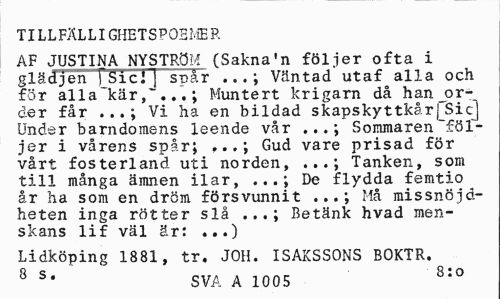 //// TILLFÄLLIGHETSPOBMER //// AF JUSTINA NYSTRÖM (Sakna'n följer ofta i glädjen fSicr] spår Väntad utaf alla och //// för alla~kär...; Muntert krigarn då han _or-der får Vi ha en bildad skapskyttkårj Sicj //// Under barndomens leende vår Sommaren "föl- //// jer i vårens spår; ...; Gud vare prisad för vårt fosterland uti norden, Tanken, som //// till många ämnen ilar, ...; De flydda femtio år ha som en dröm försvunnit ...; Må missnöjd-heten inga rötter slå Betänk hvad men- //// skans lif väl är: ...) //// Lidköping 1881, tr. JOH. ISAKSSONS BOKTR. 8 S' SVA A 1005 8:° ////