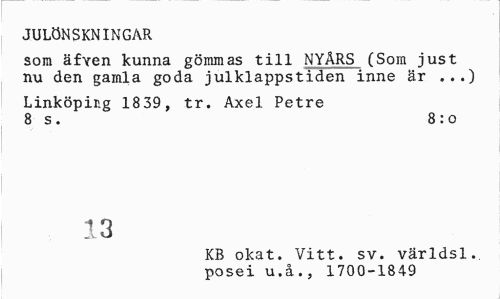 //// JULÖNSKNINGAR //// som äfven kunna gömmas till NYÅRS (Som just nu den gamla goda julklappstiden inne är ...) //// Linköping 18 39, tr. Axel Petre 8 s. 8:0 //// 13 //// KB okat. Vitt. sv. världsl.. posei u.å., 1700-1849 ////