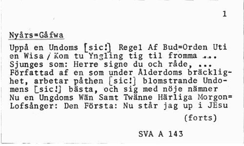 //// 1 //// Nyårs=Gåfwa //// Uppå en Undoms [sicl] Regel Af Bud=Orden Uti en Wisa/Kom tu Yngling tig til fromma . Sjunges som: Herre signe du och råde, ... Författad af en som under Ålderdoms bräcklighet, arbetar påthen [sicJ] blomstrande Undo-mens LsicJJ bästa, och sig med nöje nämner Nu en Ungdoms Wän Samt Twänne Härliga Morgon= Lofsånger: Den Första: Nu står jag up i JEsu //// (forts) //// SVA A 14 3 ////