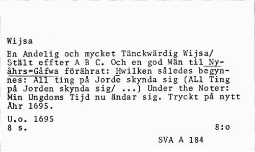 //// Wi jsa //// En Andelig och mycket Tänckwärdig Wijsa/ Stält effter ABC. Och en god Wän til Ny-åhrs=Gåfwa förährat: Hwilken således begyn-nes: All ting på Jorde skynda sig (AL1 Ting på Jorden skynda sig/ ...) Under the Noter: Min Ungdoms Tijd nu ändar sig. Tryckt på nytt Åhr 1695. //// U.o. 1695 //// 8 s. 8:o //// SVA A 184 ////