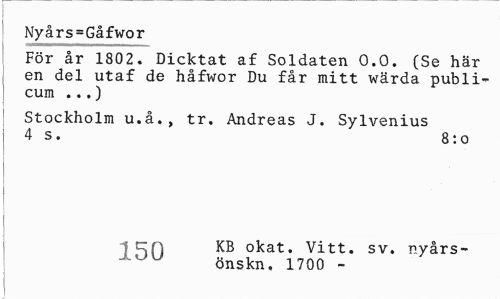 //// Nyårs=Gåfwor //// För år 1802. Dicktat af Soldaten O.O. (Se här en del utaf de håfwor Du får mitt wärda publi-cum ...) //// Stockholm u.å., tr. Andreas J. Sylvenius 4 s. 8:o //// i crn KB okat. Vitt. sv. nyårs- //// ' ' " önskn. 1700 - ////