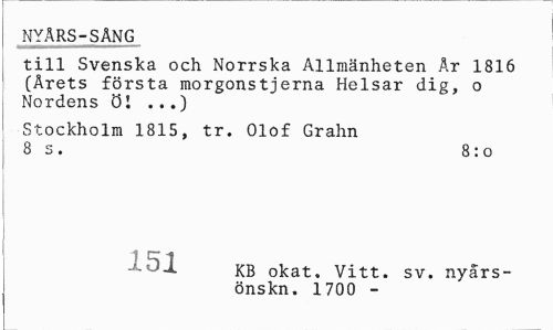 //// NYÅRS-SÄNG //// till Svenska och Norrska Allmänheten År 1816 (Årets första morgonstjerna Helsar dig, o Nordens öl . . .) //// Stockholm 1815, tr. Olof Grahn 8 s. 8: o //// -1 tr* KB okat. Vitt. sv. nyårs- //// ±°'± önskn. 1700 - ////