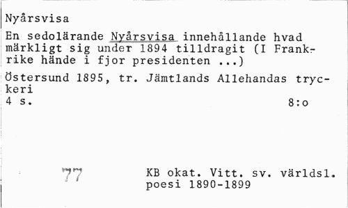 //// Nyårsvisa //// En sedolärande Nyårsvisa innehållande hvad märkligt sig under 1894 tilldragit (I Frankr rike hände i fjor presidenten ...) //// Östersund 1895, tr. Jämtlands Allehandas tryckeri //// 4 s . 8: o //// KB okat. Vitt. sv. världsl. //// poesi 1890-1899 ////