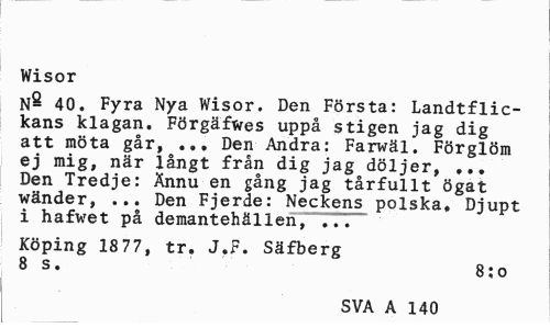 //// Wisor //// N^ 40. Fyra Nya Wisor. Den Första: Landtflic-kans klagan. Förgäfwes uppå stigen jag dig att möta går, ... Den Andra: Farwäl. Förglöm ej mig, när långt från dig jag döljer, ... Den Tredje: Ännu en gång jag tårfullt ögat wänder, ... Den Fjerde: Neckens polska. Djupt i hafwet på demantehällen, ... //// Köping 1877, tr. J.F. Säfberg 8 s. 8;o //// SVA A 605 ////