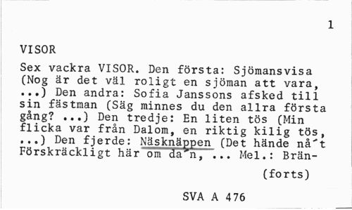 //// 1 //// VISOR //// Sex vackra VISOR. Den första: Sjömansvisa (Nog är det väl roligt en sjöman att vara, ...) Den andra: Sofia Janssons afsked till sin fästman (Säg minnes du den allra första gång? ...) Den tredje: En liten tös (Min flicka var från Dalom, en riktig kilig tös, ...) Den fjerde: Näsknäppen (Det hände nå't Förskräckligt här om da n, ... Mel.: Brän- //// (forts) //// SVA A 4 76 ////