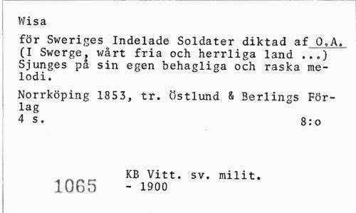//// Wisa //// för Sweriges Indelade Soldater diktad af 0,A. (I Swerge, wårt fria och herrliga land ..„) Sjunges på sin egen behagliga och raska melodi. //// Norrköping 1853, tr. östlund & Berlings Förlag //// 4 s. 8:0 //// KB Vitt. sv. milit. //// 1065 - 1900 ////