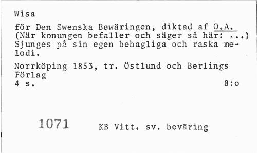 //// Wisa //// för Den Swenska Bev/äringen, diktad af O.A. (När konungen befaller och säger så här: »..) Sjunges på sin egen behagliga och raska melodi . //// Norrköping 1853, tr. östlund och Berlings Förlag //// 4 s. 8:0 //// 1071 KB Vitt. sv. beväring ////