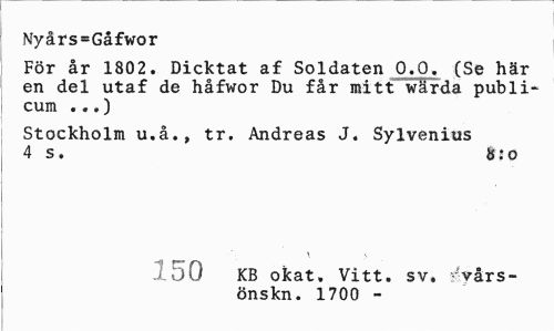 //// Nyårs=Gåfwor //// För år 1802. Dicktat af Soldaten O.O. (Se här en del utaf de håfwor Du får mitt wärda publi-cum ...) //// Stockholm u.å., tr. Andreas J. Sylvenius 4 s. b:o //// 150 //// KB okat. Vitt. sv. -vårs- //// önskn. 1700 - ////