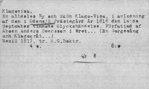 //// Klagovi sa. //// En alldeles % och Skön Klago- ai sa, i anledning af den i Oäens j ö.stegård År 1Ö15 den 14: de September rimfeäae Olyckshändelse, Författad af Atoen Anders Sirer.ason i Wret.,. (En oorgesång och Kla«cogråt, .,) Wexiö l8l7, tr. K.G.Boktr. //// 4s. 8;o //// 8 ////