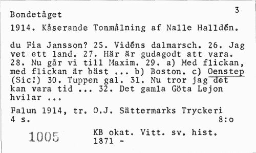 //// 3 //// Bondetåget //// 1914. Kåserande Tonmålning af Nalle Halidén. //// du Fia Jansson? 25. Vidéns dalmarsch. 26. Jag vet ett land. 27. Här är gudagodt att vara. 28. Nu går vi till Maxim. 29. a) Med flickan, med flickan är bäst ... b) Boston, c) Oenstep (Sici) 30. Tuppen gal. 31. Nu tror jag det kan vara tid ... 32. Det gamla Göta Lejon hvilar ..a //// Falun 1914, tr. O.J. Sättermarks Tryckeri 4 s. 8:o //// inner KB okat. Vitt. sv. hist. //// -lUUvJ 1871 _ ////