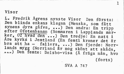 //// i //// Visor //// L. Fredrik Ågrens nyaste Visor Den första: Den blinda enkans klagan (Menska, som fått synens dyra gåfva, ...) Den andra: En tripp efter Ofotenbanan (Sommaren i Lapplands marker, OJ hvad den ...) Den tredje: En natt i Åre kyrkä i Jemtland (En femti kröner det är bra att ha - fallera, .-..) Den fjerde: Norrlands mygg (Norrland är nog skönt att skåda, ..,.-) Den femte: Delsbo-visa (A fräga nån, hvo //// (forts) //// SVA A 74 7 ////
