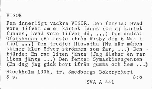 //// VISOR //// Fem innerligt vackra VISOR, Ben första: Hvad vore lifvet om ej kärlek fanns (Om ej kärlek funnes, hvad vore lifvet då, «ea) Den andra: Ofotshanan (Vi reste ifrån Wisby den 6 Maj i fjol ...) Den tredje: Hiawatha (Nu när månen skiner klar ötver strommcn som f3.i*^ Den //// fjärde: En rar liten jänta (Jag älskar en rar liten jänta ...) Den femte: Symaskinsagenten (En dag jag gick bort ifrån gumma och hem ..,) //// Stockholm 1906, tr. Smedbergs Boktryckeri 8 s. 8:0 //// SVA A 441 ////