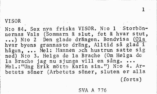 //// 1 //// VISOR //// N:o 84. Sex nya friska VISOR. N:o 1 Storbön-nernas Vals (Sommarn ä slut, fet ä hvar stut, ...) N:o 2 Ben glade drängen. Bondvisa (Ola hvar byens grannaste dräng, Alltid så glad i hågen, ... Mel; Hannen jch hustrun satte sig ned) N:o 3. Helga de la Brache (Om Helga de la Brache jag nu sjunga vill en sång. ... Mel.:"Ung Erik mötte Karin sin.") N:o 4. Arbetets söner (Arbetets söner, sluten er alla //// (forts) //// SVA A 7 76 ////