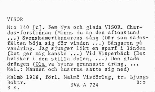//// VISOR //// N:o 140 [c]. Fem Nya och glada VISOR. Char-das-furstinnan (Minns du än den aftonstund ...) Svensk-amerikanarens sång (Där som sädesfälten böja sig för vinden ...) Sångaren på vandring. Jag sjunger likt en sparf i linden (Det ger mig kanske ...) Vid Visperbäck (Det hviskar i den stilla dalen, ...) Den glade drängen (Ola va byens grannaste dräng, ... Mel.: Mannen och hustrun satte sig ned) //// Malmö 1918, förl. Malmö Vis förlag, tr. Ljungs Boktr. SVÄ a 724 8:0 //// O So ////