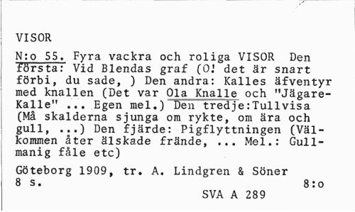 //// VISOR //// N:o 55. Fyra vackra och roliga VISOR Den första: Vid Blendas graf (O.1 det är snart förbi, du sade, ) Den andra: Kalles äfventyr med knallen (Det var Ola Knalle och "Jägare-Kalle" ... Egen mel.) Den tredje:Tullvisa (Må skalderna sjunga om rykte, om ära och gull, ...) Den fjärde: Pigflyttningen (Välkommen åter älskade frände, ... Mel.: Gull-manig fåle etc) //// Göteborg 1909, tr. A. Lindgren & Söner 8 s. 8:o //// SVA A 289 ////