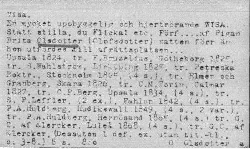 //// Vi sa. //// En mycket uppbygg*l'i st och hj ertrörarde WISA. Statt stilla, du Flicka: etc. Förf...af Pigan Brita »dotter (Olofsdotter) natten förr än hon utirorcfes af rattsplat sen . . . //// ITpsala- 1824, tr. F.BruaelJus, Octheborg 182*, tr. S .Wahl st rem , Li n-.öping 182*. tr. Petreska B ok t r., Stockholm l8?c, (4 s . ), tr, Elmer och Granberg, Skara 1826, tr. C.M.Torin, Calmar 1827, tr, C.v.Berg, Upsala 1834, (4 ».), tr. S, P.Leffler, (2 ex.), Fahlun 1842, (4 s,/. tr, ?,A.Huld vTg, Iiudiks-w.all.l34y (4 s. , 2 var.}, tr. P.A.Huldberg, Hernöaand l86c, (4 ».i tr. G, C. af Alercker. Luleå l8o8, (4 3. ) , tr, G.C. af K.lercker, (Dessutom 1 def. ex. utan ti t. »bl., s. 3-8.) 8 s. 8:o O Glad o 1.1 er a ////