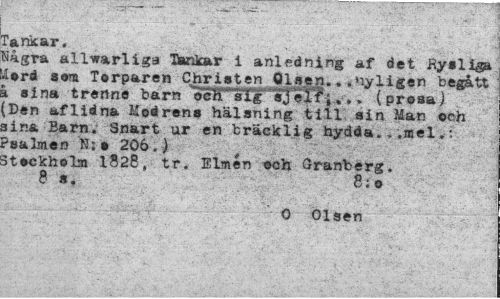 //// rankar. //// Några allwarliga Hankar i anledning af det fiysliga iard som Torparen Christen Oisen.. .nyligen begått i sina trerine barn sig^ »... (prosa) //// (Den aflidna Modrens hälsning till sin Man och 3ina Barn. Snart ur en bräcklig hydda...mel.: Psalmen N;• 206.) //// Stockholm 1828, tr. Elmen och Granberg. 8 a» 8:0 //// 0 Oisen ////