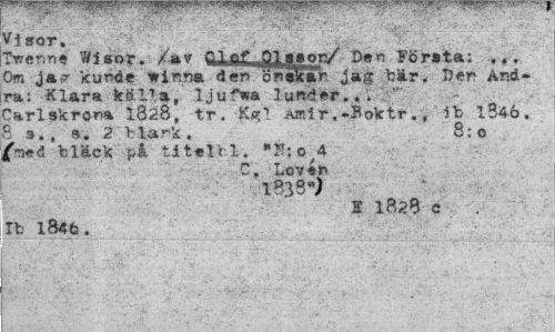 //// ... „..,. //// Visor. //// Twenn* Wisor. /»v tnnf ft?ff*nr,/ Första; ... Om ja? kund* wir.n* denonekTr jag bär. Der Andra: Klara källa, ljufwa lundar... " //// Carlskrom 1828, tr. Kgl Amir.-Boktr., ib 1546. //// 8 3., a. 2 blark. 8:o //// /med bläck på tit«Vtl. "fT;0/4 //// C. Lovsr //// i $38") //// E 1828 c //// Ib 1846. ////