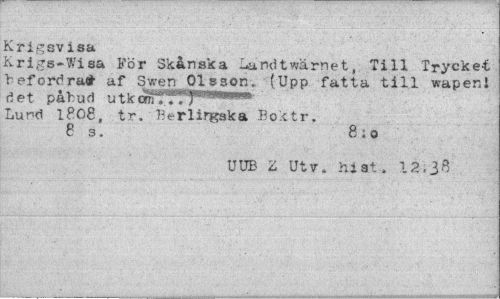 //// Krigsvisa //// Krigs-Wisa För Skånska Landtwärnet, Till Trycket befordra* af Sv.-en Olsson. (Upp fatta till waperi det påbud uXkarfTTtT™****" Lund 1808, tr. Berlirgska Boktr. //// 8 3. 8 ; o //// UUB Z Ut v. hi st. 12,38 ////