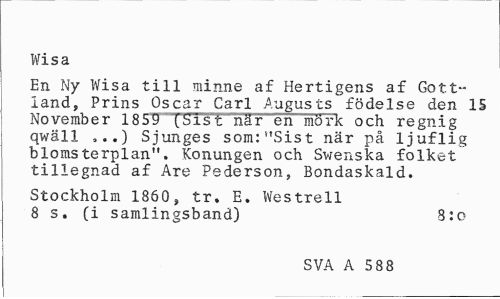//// Wisa //// En Ny Wisa till minne af Hertigens af Gott-land, Prins Oscar Carl Augusts födelse den 15 November 1859 (Sist när en mörk och regnig qwäll ,..) Sjunges som:"Sist när på ljuflig blomsterplan". Konungen och Swenska folket tillegr.ad af Are Pederson, Bondaskald. //// Stockholm 1860, tr. E. Westrell 8 s. (i samlingsband) 8:o //// SVA A 5 88 ////