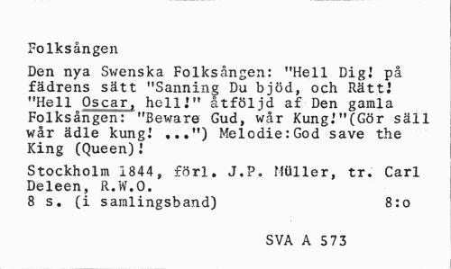 //// Folksången //// Den nya Swenska Folksången: "Hell Dig! på fädrens sätt "Sanning Du bjöd, och Rätt! "Hell Oscar, helli" åtföljd af Den gamla Folksången: "Beware Gud, wår Kung.'"(Gör säll wår ädle kung! ...") Melodie:God save the King (Queen)! //// Stockholm 1844, förl. J.P. Möller, tr. Carl Deleen, R.W.O. //// 8 s. (i samlingsband) 8:0 //// SVA A 5 73 ////