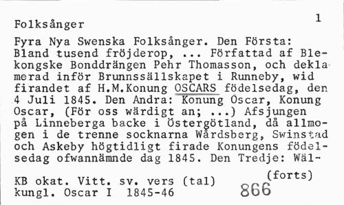 //// Folksånger 1 //// Fyra Nya Swenska Folksånger. Den Första: Bland tusend fröjderop, ... Författad af Ble-kongske Bonddrängen Pehr Thomasson, och dekla merad inför Brunnssällskapet i Runneby, wid firandet af H.M.Konung OSCARS födelsedag, den 4 Juli 1845. Den Andra: Konung Oscar, Konung Oscar, (För oss wärdigt an; ...) Afsjungen på Linneberga backe i Östergötland, då allmogen i de trenne socknarna Wardsberg, Swinstad och Askeby högtidligt firade Konungens födelsedag ofwannämnde dag 1845. Den Tredje: Wäl- //// KB okat. Vitt. sv. vers (tal) , (forts) kungl. Oscar I 1845-46 öbb ////