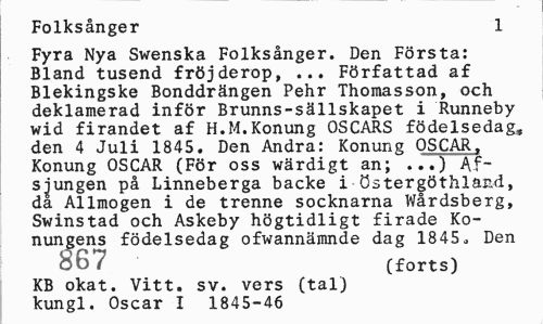 //// Folksånger 1 //// Fyra Nya Swenska Folksånger. Den Första: Bland tusend fröjderop, ... Författad af Blekingske Bonddrängen Pehr Thomasson, och deklamerad inför Brunns-sällskapet i Runneby wid firandet af H.M.Konung OSCARS födelsedag, den 4 Juli 1845. Den Andra: Konung OSCAR, Konung OSCAR (För oss wärdigt an; ...) Af~ sjungen på Linneberga backe i östergöthlaad, da Allmogen i de trenne socknarna Wårdsberg, Swinstad och Askeby högtidligt firade Konungens födelsedag ofwannämnde dag 1845. Den //// 867 (forts) //// KB okat. Vitt. sv. vers (tal) kungl. Oscar I 1845-46 ////