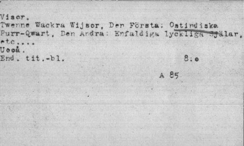 //// H s or. //// rwenne Wackra Wijsor, Der Första; Ostindisk». Purr-Q,wart, Don Ardra : Enfaldiga lyckiiM Jtfälar, ktc ... J o oå . //// End . t it.-bl. S.o //// A 85 ////