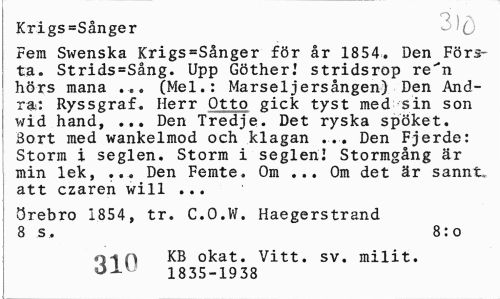 //// Krigs»Sånger //// Fem Swenska Krigs=Sånger för år 1854. Den Första. Strids=Sång. Upp Göther! stridsrop re^n hörs mana ... (Mel.: Marseljersången) Den Andra: Ryssgraf. Herr Otto gick tyst med sin son wid hand, ... Den Tredje. Det ryska spöket. Bort med wankelmod och klagan ... Den Fjerde: Storm i seglen. Storm i seglen! Stormgång är min lek, ... Den Femte. Om ... Om det är sannt, att czaren will ... //// Örebro 1854, tr. C.O.W. Haegerstrand 8 s, 8: o //// o-in KB okat. Vitt. sv. milit. 1835-1938 ////