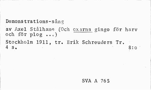 //// Demons t ra t i ons-s ån g //// av Axel Stålhane (Och oxarna gingo för harv och för plog .. 0) //// Stockholm 1911, tr. Erik Schreuders Tr. 4 s. 8:0 //// SVA A 76 5 ////